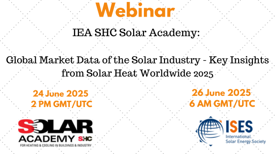 On 24 and 26 June April, ISES is happy to welcome IEA SHC to hold a webinar as part of the IEA SHC Solar Academy series presenting Global Market Data of the Solar Industry - Key Insights from Solar Heat Worldwide 2025.
