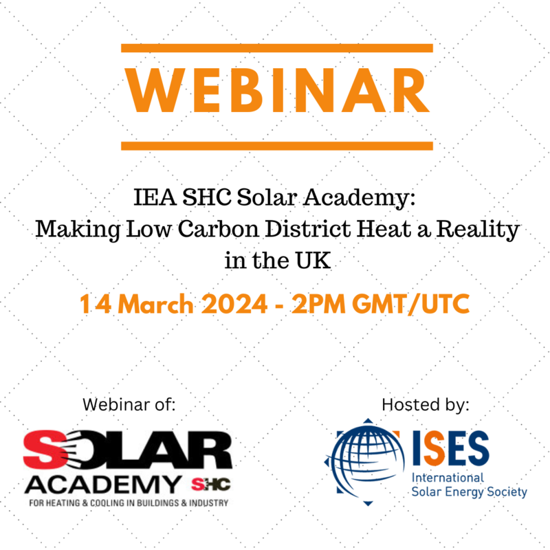 The webinar is organised by the Solar Academy of the IEA Solar Heating and Cooling Programme and hosted by ISES, the International Solar Energy Society.
