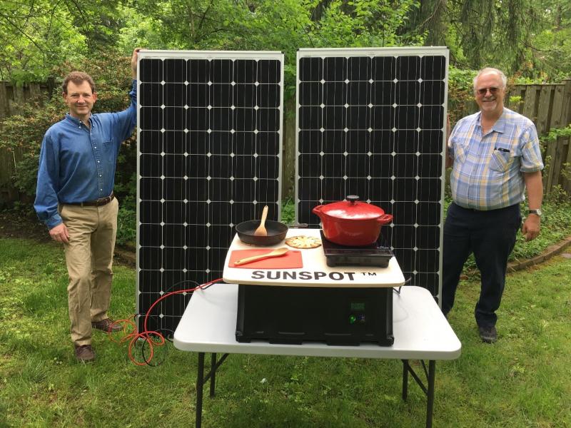 Paul Carroll and Douglas Danley (right) stand alongside the Sunspot Solar Electric Cooker. Danley, Carroll and team members Teresa Danley, and Vladimir Brunstein (not pictured) were this year’s winners of the Elsevier-ISES Renewable Transformation Challenge (Credit: Douglas Danley).