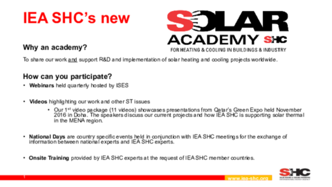The SHC Solar Academy is a means to share key results of the IEA SHC Programme with stakeholders from business and science. The webinars are one of four ways in which the IEA SHC is reaching out to a global audience to exchange information and to support R&D efforts and the implementation of solar heating and cooling projects all over the world. For more information on other Solar Academy activities, please go to: https://www.iea-shc.org/solar-academy
