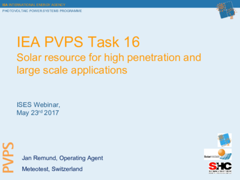 - Jan Remund, Meteotest: Overview of the new IEA PVPS Task 16 - Solar resource for high penetration and large scale applications. The approach and goals of the new Task will be shown aside as short overview of the results of the preceding solar resource Task 46.