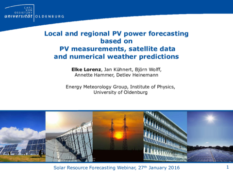 Dr. Elke Lorenz - received her Diploma degree in physics at the University of Oldenburg in 1996. Since then she has been working in the Energy Meteorology group of the Energy and Semiconductor Research Laboratory (EHF) at the Institute of Physics at Oldenburg University, where she also did her PhD thesis on satellite based short term forecasting of solar radiation. Her research focus is on solar irradiance and PV power forecasting and on methods to derive solar resource data from satellite images. Since the beginning of 2011 she heads the solar team of the Energy Meteorology group.
